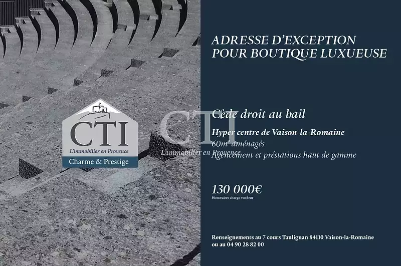 Opportunité exceptionnelle dans l’hyper centre de Vaison-la-Romaine, ce local commercial idéalement situé bénéficie d’un emplacement rare et privilégié au cœur de la ville. D'une surface d'environ 60 m², il est parfaitement adapté à tout type de commerce.