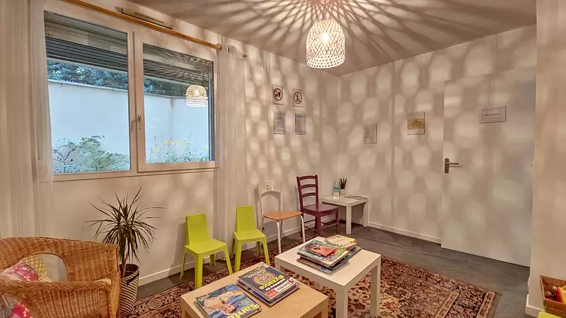 Il se compose d'une entrée, d'un salon-séjour (actuellement cabinet de podologie) ouvrant au Sud sur la terrasse et le jardin privatif, d'une cuisine, d'un dégagement desservant deux chambres (actuellement salle d'attente et bureau de consultation), une salle de bain et des toilettes séparées.