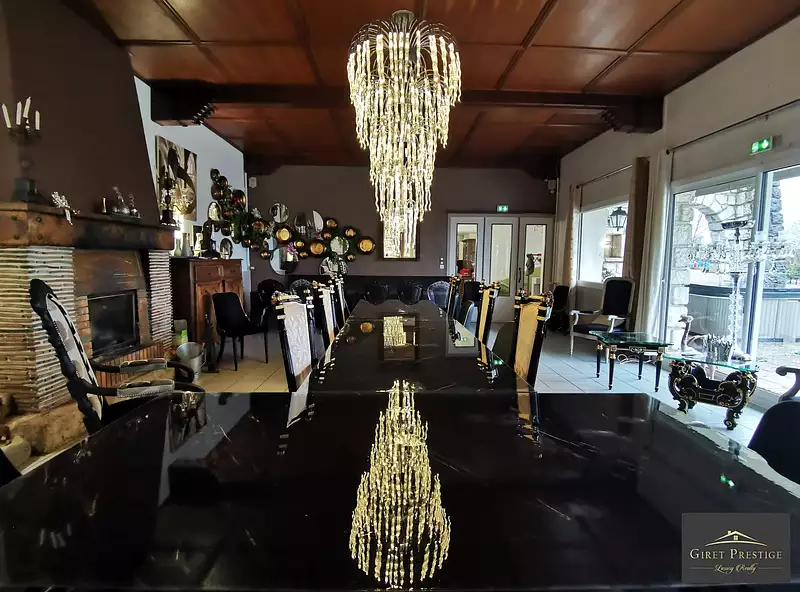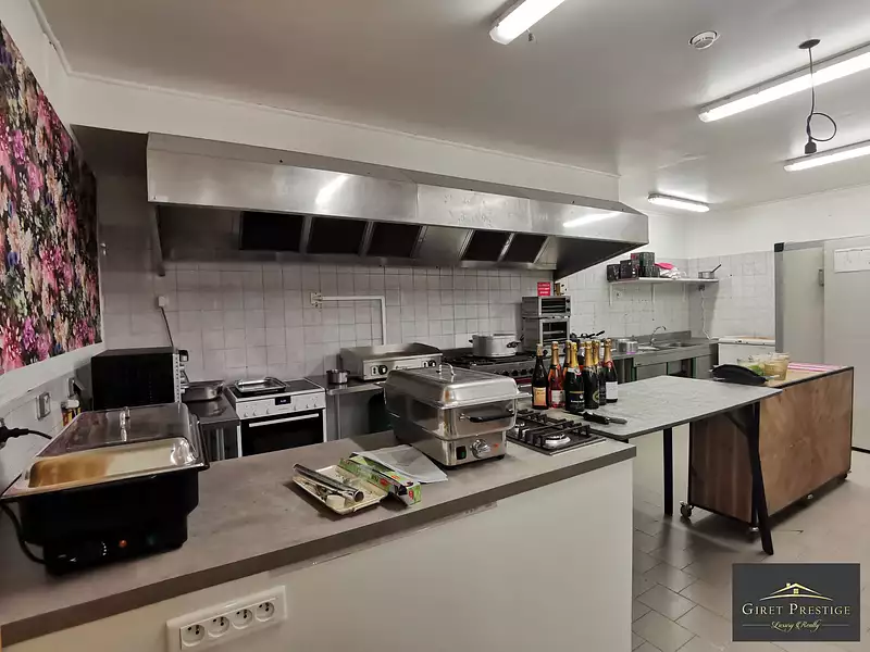 * En rez-de-chaussée : quatre grandes pièces spacieuses vous accueillent (environ 110m2 pour les 2 pièces principales, environ 96m2 pour la partie réception/salon/bar), cuisine professionnelle (environ 80m2), toilettes et divers.