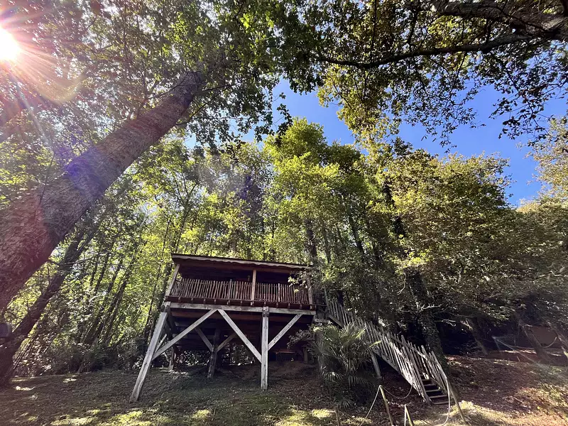 Nichées dans les arbres, au milieu d'une forêt de chênes et chataîgniers, ces deux cabanes en structure bois, perchées à 5 mètres du sol, vous invitent au calme et à la détente.Le plus spacieuse des deux, en duplex, d'une surface de 38 m², comprend une pièce principale avec un séjour / coin cuisine ouvrant sur la terrasse, une salle de douche / wc, ainsi qu'un débarras. La chambre se trouve à l'étage. La cabane est complétée par un vaste espace couvert avec spa et sauna, ainsi qu'une superbe terrasse avec vue.La seconde cabane de 29 m² abrite une charmante chambre avec sa salle de douche / wc attenante. Son atout ? Son balcon qui se prolonge sur une belle terrasse couverte et équipée d'un spa.Vous aurez la possibilité de les occuper toute l'année grâce à leur contort : raccordement à l'électricité, production d'eau chaude via deux cumulus, climatisation, assainissements autonomes, cuisine, salles de douche complètes.Vous êtes à la recherche d'une nouvelle opportunité entrepreneuriale ? Vous souhaitez reprendre une activité bien implantée dans son environnement local et la développer ? La parcelle à la destination 'zone touristique' sur le futur PLUi donne matière à de beaux projets de développement!Attention. vous pourriez bien tomber sous le charme de ce bien atypique !Informations LOI ALUR : Honoraires charge vendeur. (gedeon_54913_31926778)