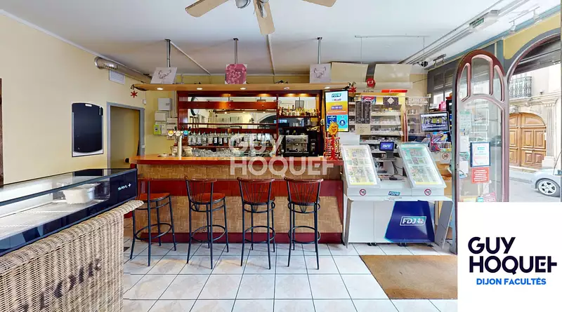 En exclusivité , un fonds de commerce a vendre en Centre Ville (Bar , Tabac , Jeux ) , avec un potentiel de développement important. Ouvert actuellement du Lundi au Samedi de 8h00 à 20h00 , avec une autorisation prefectorale d' ouvrir jusque 1H30 (non exploitée à ce jour ) , et la possibilité de developper une activité de restauration rapide à emporter . Durée du bail restant a courir : 6 ans Montant du loyer annuel brut : 9 566,40 euros Montant de la provision annuelle de charges : 300 euros DPE : F Cette annonce est rédigée par Fabien PAVARANI , agent commercial (E.I) , immatriculé au RSAC de Dijon sous le numéro 943 283 051. Prix de vente : 55 000 euros ( honoraires d'agence inclus : 8,20%) Les informations sur les risques auxquels ce bien est exposé sont disponibles sur le site Géorisques : www. georisques. gouv. fr.