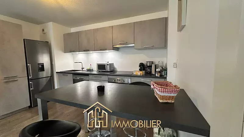 - à droite, sur une cuisine ouverte et son salon/séjour donnant accès à la terrasse par une porte fenêttre;