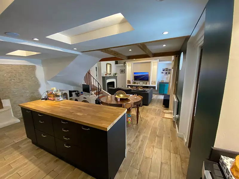 Au 1er étage : une pièce à vivre de presque 40m² avec cuisine ouverte et entièrement équipée et une terrasse fermée exposée plein sud avec véranda.