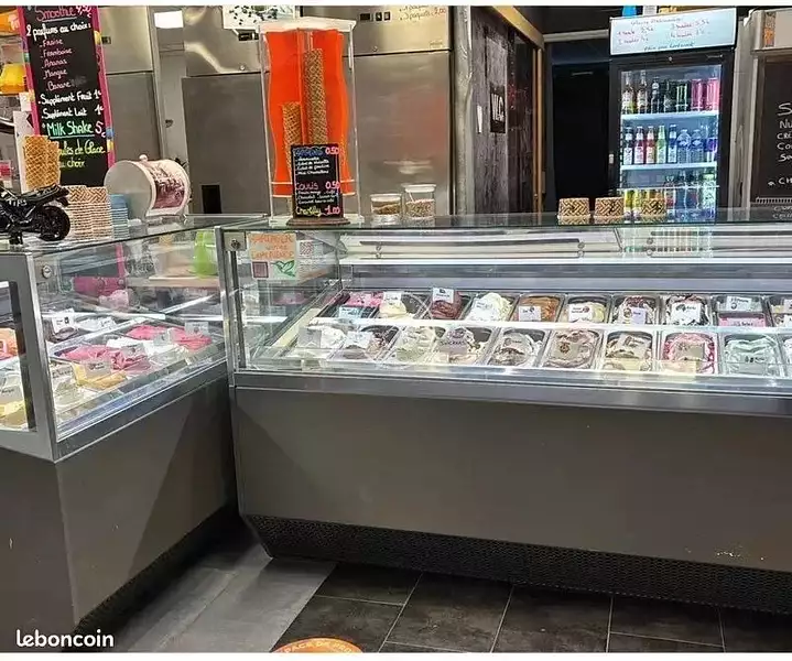 Glacier Snack avec deux points de vente et deux terrasses de chaque cotés d'une rue très passante .