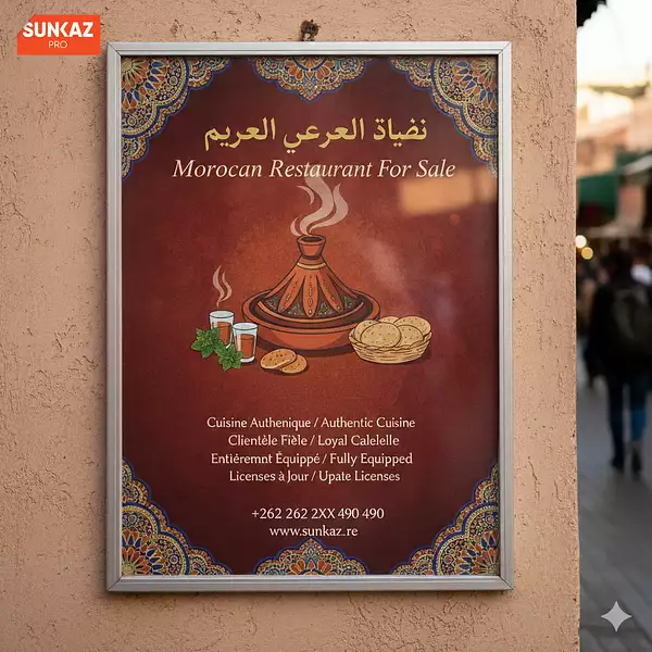 Ambiance des souks, parfums d'épices, authenticité d'un décor oriental : ce restaurant vous transporte dès le seuil franchi. Une adresse connue, appréciée, installée depuis plusieurs années dans le sud de l'île. Ce fonds de commerce propose une salle chaleureuse à l'identité marquée, inspirée des traditions orientales. Couscous, tajines, cornes de gazelle et autres délices y sont servis dans un cadre soigné qui invite au voyage. Ces spécialités sont à déguster sur place ou à emporter. La cuisine est bien équipée, fonctionnelle, prête à l'exploitation. Situé sur un axe à fort passage, au coeur de ville de Saint-Louis le restaurant bénéficie d'une excellente visibilité et d'un flux constant de clients. La réputation de l'établissement et sa clientèle fidèle assurent un bon démarrage pour toute reprise. Actuellement CA moyen mensuel : 28 000 euros Prix de vente du fonds : 177 360 euros HAI Envie d'en savoir plus ou de visiter ? Contactez l'agence au +262 262 490 490. (10.85 % honoraires TTC à la charge de l'acquéreur.)