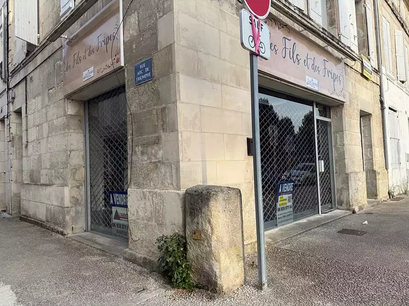 LOCAL COMMERCIAL - VENDU Libre, en bon état de 45m². Très bien situé au centre historique de SAINTES et au pied de l'ARC de Germanicus. Deux pièces (boutique et bureau), arrière boutique, wc. Chauffage électriques, 3 rideaux de fer. compteurs individuels.