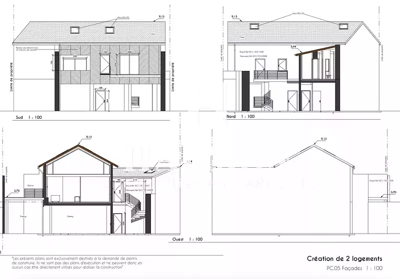 • Permis de construire déjà validé : transformation des niveaux supérieurs en 2 appartements T3 en duplex : coût des travaux 300 000 € estimés.