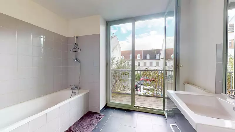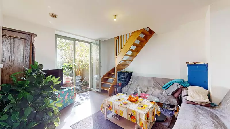 Le duplex en rez-de-chaussée de 58,90 m² se compose d'une entrée, d'un salon/séjour ouvert sur une cuisine avec accès à une terrasse et jardin, deux chambres à l'étage, une salle de bain avec balcon et un WC séparé. Actuellement loué depuis juillet 2023, ce logement génère un loyer de 548 € + 180 € de charges.