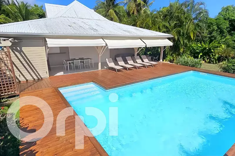 À l'arrière de la propriété, une charmante dépendance, d'environ 30 m², au style tropical, vous accueille avec sa terrasse ombragée et son bac à punch privatif. Un véritable cocon, parfait pour recevoir ou générer des revenus locatifs.