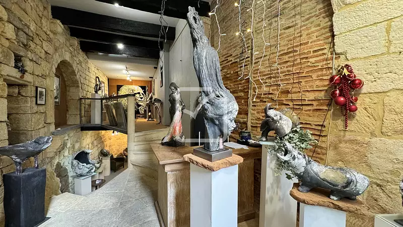 Rez-de-rue :Galerie d’Art d’environ 55,31m2 avec poutres apparentes & murs en pierres répartis sur 2 niveaux par un escalier à vis en pierre.