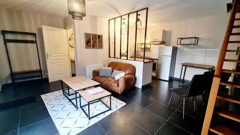 Un appartement LOUE en duplex d'environ 81 m2 comprenant : Au RDC, un séjour/cuisine équipée, une buanderie et un wc. A l'étage, un palier desservant trois chambres et une salle d'eau.