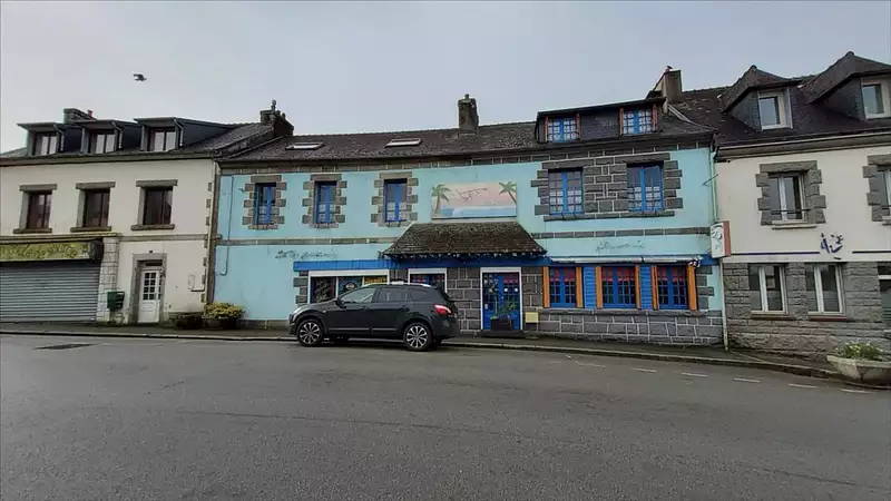 HUELGOAT. A VENDRE MUR ET FONDS. IMMEUBLE A USAGE DE COMMERCE ET HABITATION SITUE AU CENTRE D'HUELGOAT A PROXIMITE DU LAC ET DE LA FORET, COMPOSE: REZ DE CHAUSSEE: salle + bar de 80m² - sanitaires - cuisine - arrière cuisine - réserve à l'arrière du bar. 1er ETAGE: un ancien appartement à rénover (séjour - salle de bains - wc - réserve) + 3 pièces. 2ème ETAGE: 2 chambres - grenier.