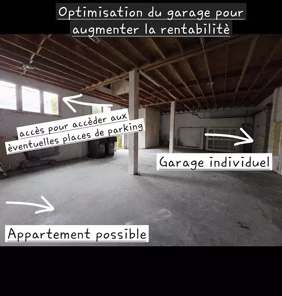 Grand garage avec possibilité de créer : 1 appartement, 1 accès aux places de parking, un garage à porte sectionnelle