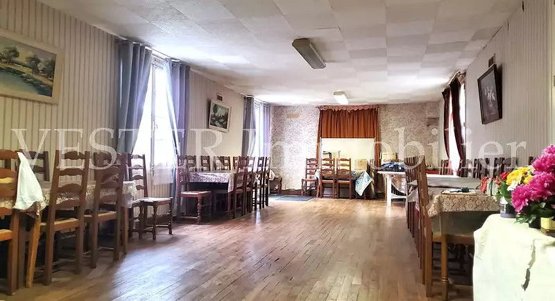 Le commerce, situé en face de l'église du village, a gardé tout son charme d'antan. Vous trouverez au RDC : une salle de bar/restaurant avec son billard, une grande salle de réception lumineuse avec du parquet massif au sol , une cuisine et arrière cuisine avec son piano de cuisson et sa friteuse professionnelle.