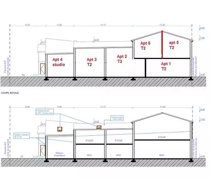 PS: Un permis de construire a déjà été accordé pour une partie en maison principale et le reste en locatif (3 appartements). Il peut être rapidement modifié pour créer les entrées supplémentaires pour la configuration projetée de 6 appartements.