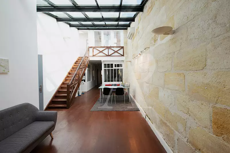 A quelques pas de la Basilique Saint-Seurin, ces bureaux répartis sur deux niveaux prennent place au sein d'un bel immeuble en pierre traversant, composé de trois lots. D'une superficie d'environ 240 m², le local se compose au rez-de-chaussée de plusieurs salles de travail modulables, offrant de nombreuses possibilités d'aménagement selon les besoins. A l'étage, un palier lumineux dessert deux vastes bureaux ainsi qu'un espace sanitaire comprenant deux WC séparés. L'ensemble bénéficie d'une luminosité exceptionnelle, mise en valeur par une superbe verrière. La double hauteur sous plafond confère quant à elle un volume généreux et une atmosphère particulièrement agréable. Enfin, un patio privatif de 8,30 m² vient compléter cet ensemble, offrant un espace extérieur. Le bien est vendu loué, avec un bail commercial en cours. Copropriété de 3 lots - dont 2 lots habitation.(Pas de procédure en cours).
