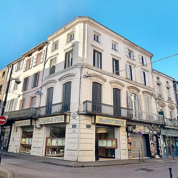Hyper-centre de Pamiers dans une rue principale du centre ville, immeuble d'angle R+3 d'une