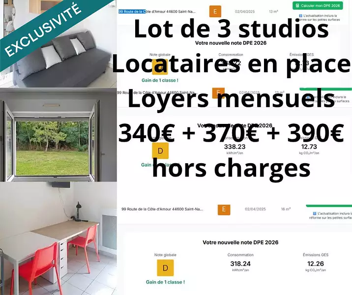 Situé à Saint-Nazaire (44600), ce studio bénéficie d'un emplacement idéal offrant un accès facile aux commodités essentielles telles que les transports en commun avec la proximité des lignes de bus. Les studios font 13m² et 16 m², et sont situés au rez-de-chaussée. Il se compose d'une entrée, d'une couchette, d'un séjour avec placard et coin cuisine, ainsi que d'une salle d'eau avec WC. Construit en 1990, la résidence est sécurisée par un portail, un digicode et des caméras de surveillance. Le logement est raccordé à la fibre. Cette propriété compacte offre un investissement fonctionnel.Le DPE passera en D en janvier 2026 d'après le simulateur de casam-pro sans réaliser aucun travaux supplémentaire