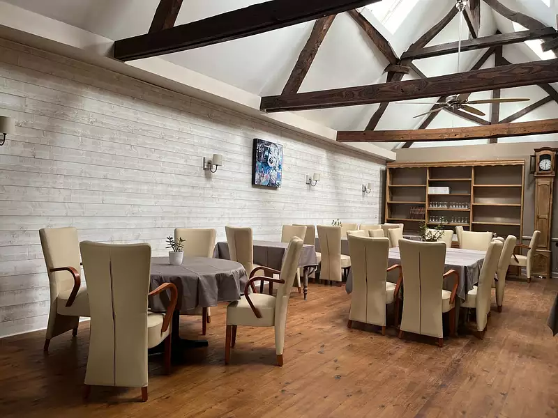Le commerce comprend : une grande salle de réception, salle de restauration de 90 m2 avec belle hauteur sous-plafond, charpente apparente, parquet d'origine.