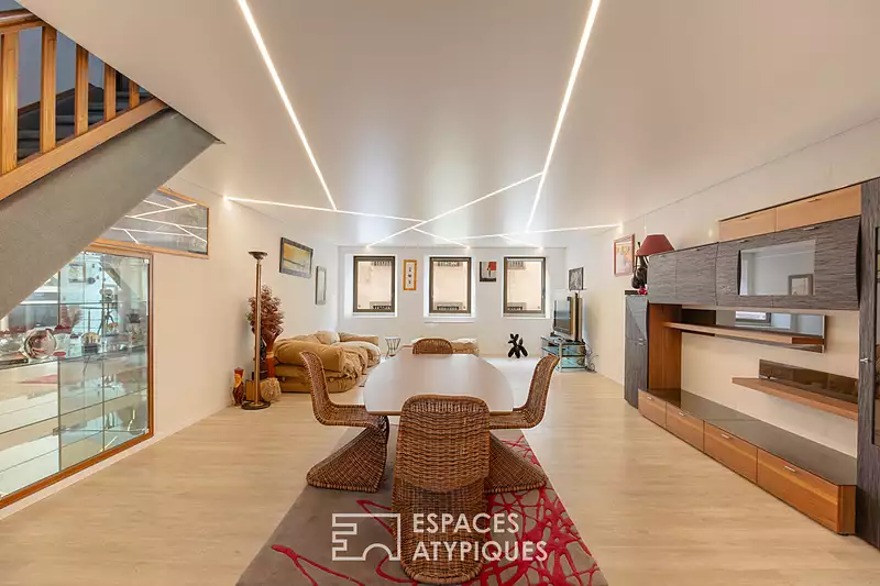Situé en plein centre-ville, cet ensemble immobilier se compose de deux immeubles réunissant cinq appartements aux surfaces généreuses de 249, 71, 27, 72 et 79 m². L'appartement principal, véritable pièce maîtresse de l'ensemble, offre une organisation harmonieuse des volumes, un style singulier et de multiples possibilités d'aménagement, complétés par un sous-sol complet et un double garage. L'intérieur de l'appartement principal dévoile une distribution fluide et lumineuse. Le premier niveau accueille un vaste salon-séjour ouvert sur une salle à manger conviviale, créant un espace de vie idéal pour recevoir. La cuisine, prolongée par une terrasse attenante, constitue un lieu agréable pour profiter d'un temps de pause au calme. A l'étage, une suite parentale occupe tout le niveau : une chambre spacieuse, un dressing aménagé et une salle d'eau contemporaine forment un ensemble confortable et fonctionnel. Une grande pièce d'environ 60 m² complète l'étage, pensée pour s'adapter à différents usages, qu'il s'agisse d'un espace de loisirs, d'un bureau ou d'un atelier. Le troisième niveau rassemble deux chambres supplémentaires ainsi qu'une salle d'eau. Le dernier niveau propose enfin une belle pièce lumineuse de plus de 20 m² ajoutant encore un potentiel appréciable à l'ensemble. Les extérieurs offrent plusieurs atouts rares en coeur de ville. La terrasse attenante à la cuisine crée un véritable prolongement de l'espace intérieur, idéal pour profiter d'un repas en plein air. Le double garage et le sous-sol complet représentent des prestations recherchées, apportant confort et capacité de stockage. L'ensemble immobilier, composé de deux bâtiments distincts, permet par ailleurs d'envisager la location partielle ou totale de certains lots, ouvrant la voie à un investissement modulable et patrimonial. L'environnement immédiat bénéficie de toutes les commodités : commerces, écoles et services se trouvent à quelques minutes à pied, offrant une qualité de vie appréciable et pratique dans un centre-ville vivant. Par son organisation, ses volumes rares et la singularité de ses espaces, cet ensemble immobilier se distingue comme un bien atypique et modulable. Il offre un potentiel remarquable, tant pour une résidence principale de caractère que pour un projet mixte associant habitation et investissement. Commerces à 5 min à pied Ecoles à 5 min à pied Bus à 5 min à pied CLASSE ENERGIE : C / CLASSE CLIMAT : A Montant moyen estimé des dépenses annuelles d'énergie pour un usage standard, établi à partir des prix moyens des énergies indexés sur les années 2021, 2022, 2023 (abonnements compris) : entre 3500 et 5000 euros Contact : Sébastien 06.34.67.38.68 Sébastien DEPREZ (EI) Agent Commercial - Numéro RSAC : 912 626 496 - Mulhouse.