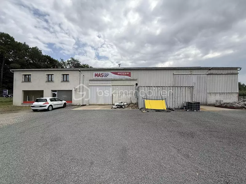Un très grand hangar avec grenier, vestiaires, toilettes, bureaux, vitrine, salle de pause avec cuisine d'appoint.