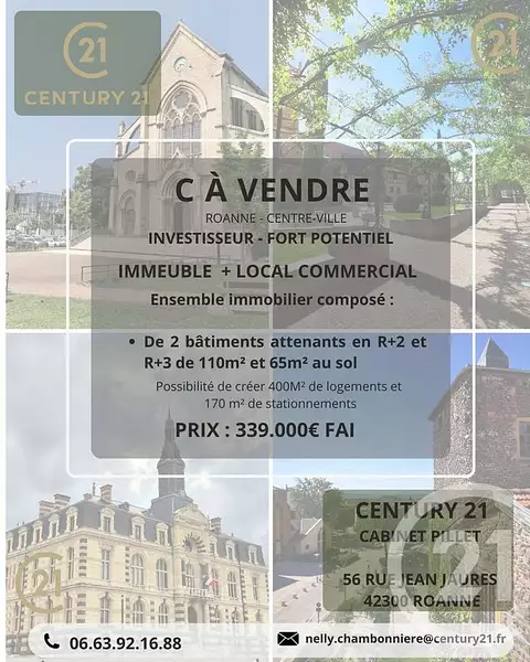C A Vendre - INVESTISSEURS - ROANNE CENTRE - OPPORTUNITE - ENSEMBLE IMMOBILIEREn plein cœur du centre ville de Roanne composé :-D'un bâtiment R+2 de 110 m² au sol -D'un 2ème, attenant, en R+3 de 65m² au sol,Chaudière fuel, monte-charges...Résumé : 175 m² de stationnements couverts, 420 m² de surface pour activités professionnelles ou commerciales ou atelier ( ou habitables à créer) Me contacter pour tous renseignements et/ou visite, au O6.63.92.16.88 ou nelly.chambonniere@