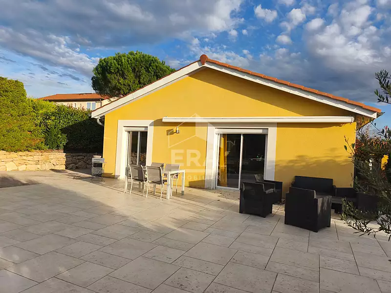 Dans un cadre résidentiel paisible, cette maison de plain-pied construite en 2001 séduit par son agencement fonctionnel, sa luminosité et son environnement verdoyant. D'une surface d'environ 100 m², elle s'ouvre sur une vaste pièce de vie conviviale , lumineuse et climatisée dotée d'une cuisine moderne, entièrement équipée, ouverte sur le séjour et donnant accès à la terrasse. La partie nuit comprend quatre chambres confortables, une salle de bains et des toilettes indépendantes. L'extérieur invite à la détente avec son terrain plat de 838 m², entièrement clos et joliment arboré, sa grande terrasse carrelée de 45 m², parfaite pour les repas d'été, ainsi qu'une dépendance idéale pour le rangement ou les loisirs. Un garage attenant vient compléter l'ensemble. Vous apprécierez la vue dégagée, le calme environnant et la qualité d'entretien de cette maison prête à accueillir votre famille.