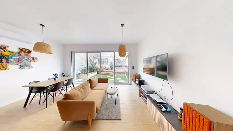 Cette pièce de vie avec ses grandes baies vitrées vue sur le jardin et son spa/jacuzzi.