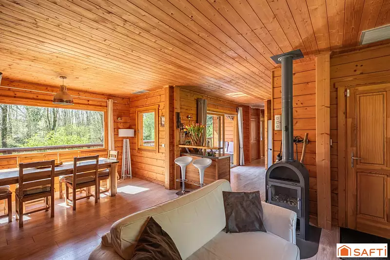 Sa construction en bois massif lui confère un cadre de vie chaleureux et ouvert sur l’extérieur, au cœur d’un terrain arboré de 2100 m² avec ses arbres fruitiers.