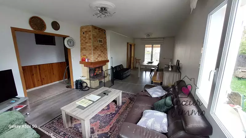 d'une entrée, un salon-séjour traversant et lumineux (équipé d'une cheminée à foyer fermé), une cuisine fermée équiqée-aménagée (avec un accès à la terrasse et au jardin ).