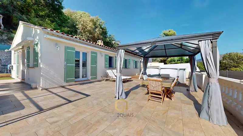 Maison jumelée par le garage uniquement, 5 pièces de 100 m², en excellent état et parfaitement entretenue. Elle bénéficie d’une grande terrasse, d’un jardin en restanques plates, d’une piscine et d’un jacuzzi offrant une superbe vue mer et collines, le tout dans un calme absolu sur un terrain de 1 600 m².