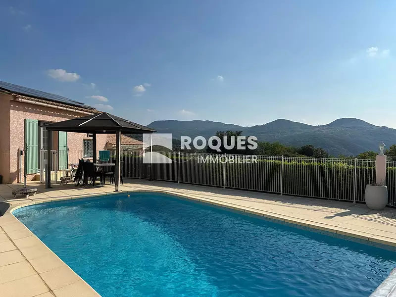 Vous bénéficiez d'un parking avec 5 places dont deux places couverte, d'une terrasse 20 m2 couverte, d'une terrasse 33 m2, piscine chauffée 8x4 sécurisé offrant une superbe vue dégagée sans vis a vis exposée Sud.