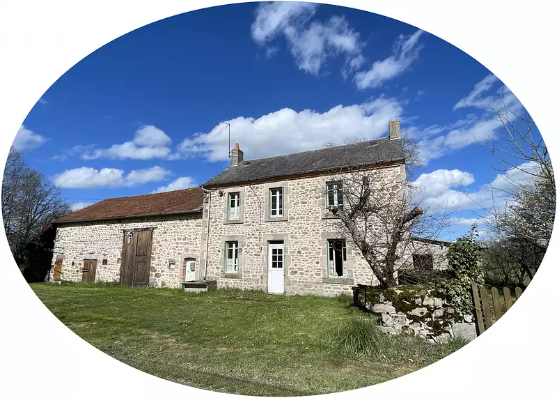 Auv 1137 : Maison et grange en pierres, puits, belle vue, 7400m2 Cette maison en pierres est en bon état général, la structure est très solide mais l'intérieur nécessite une rénovation. La grange peut également être intégrée à la maison, transformée en une maison séparée, etc. À gauche, il y a une autre partie ouverte, et à droite, une dépendance qui était utilisée comme poulailler. La bande de terrain devant la maison fait partie de la propriété, et à l'arrière et sur les côtés se trouve un très grand terrain avec plusieurs grands arbres et une vue dégagée. Il y a une fosse septique non conforme mais fonctionnelle. Bel ensemble pour de nombreux projets. La maison peut être habitée de manière primitive, en fait, tout est là, sauf un poêle à bois pour le chauffage. Il y a donc réellement le choix, une grande rénovation est également possible. La porte d'entrée est en PVC avec double vitrage mais le reste des fenêtres est d'origine en simple vitrage. La superficie intérieure totale de la maison est de 52m2, avec un rez-de-chaussée, un premier étage et un grenier qui n'est pas très haut. La grange fait 12m × 6m et mesure 6,5m de hauteur. Il y a une cuisine-salle à manger (19,5m2, 2m60 de hauteur) avec cheminée, sol en ciment, placard intégré où un accès facile peut éventuellement être aménagé vers la grange, évier, et le compteur Linky pour l'électricité. L'installation électrique n'est pas conforme mais fonctionne. À droite, il y a un salon (19,5m2) avec parquet en chêne, placard encastré, petite cheminée en marbre. À l'arrière, séparé par une cloison, il y a un palier (9,5m2) avec à gauche le chauffe-eau et une porte menant à une souillarde (6m2) et un four à pain d'origine. À droite se trouve une salle d’eau fonctionnelle (3m2) avec douche et toilettes. Un escalier étroit mène à l'étage supérieur, avec un petit hall (5,5m2) et une fenêtre donnant sur le terrain à l'arrière qui est maintenant inclus dans la vente de la maison. Très belle vue. Autrefois, les vaches venaient jusqu'à la maison et l'arrière n'était pas utilisé, mais cela pourrait changer maintenant que le terrain est inclus, ce qui est intéressant ! Il y a aussi une chambre de taille normale à l'avant de la maison (12,5m2, hauteur 2m40 sous les poutres) et une chambre beaucoup plus grande (31m2) actuellement utilisée comme dortoire. Il y a également des WC et un lavabo ici, reliés à la fosse septique. Un escalier raide mène au grenier, mais il n'est pas assez haut au faîtage pour créer de très grands espaces. Le toit de la maison est en ardoises fibro amiante, la grange a un toit en tuiles, et les dépendances latérales et arrière ont des toits en plaques d'amiante. Très bel ensemble avec de nombreuses possibilités.