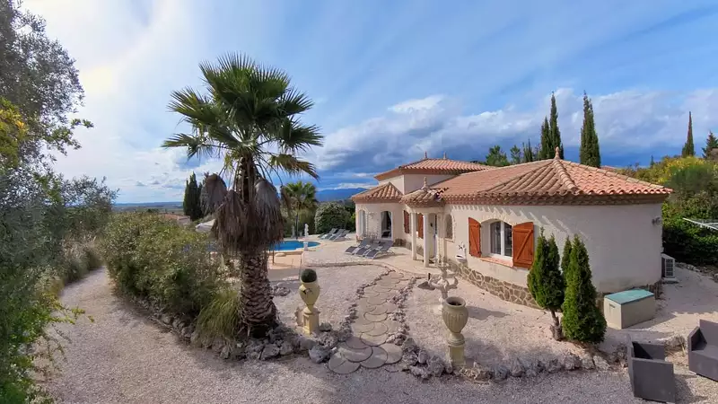 Villa Méditerranéenne Exclusive (100 m²) avec vue panoramique, 3 chambres, 2 salles d'eau, climatisation, carport, studio, piscine et magnifique Jardin (1100 m²) à Oupia (34210 - Hérault)