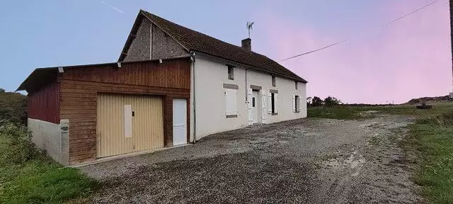 Secteur Saint Hilaire La Treille, maison de plain-pied située à l'écart de toute habitation sur un large terrain de 5 506m2 avec vue dégagée sur la campagne comprenant une pièce de vie avec coin salon avec cheminée insert et poêle à granulés et coin cuisine aménagée avec évier et plaques de cuisson, salle d'eau avec WC séparés, trois chambres, grenier au-dessus avec ballon d'eau chaude. Assainissement par fosse septique non conforme. Garage attenant. Petits toits non attenants. Terrain attenant.