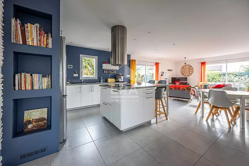 Construite en 2014, elle dispose d'un salon- séjour, cuisine ouverte, trois chambres, salle d'eau, WC, cellier, terrasse, garage traversant et un très joli jardin ; un spa complète le tout.