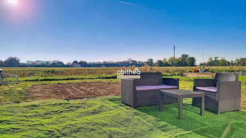 Elle offre 99 m2 sur 444 m2 de terrain avec vue dégagée sur les champs.