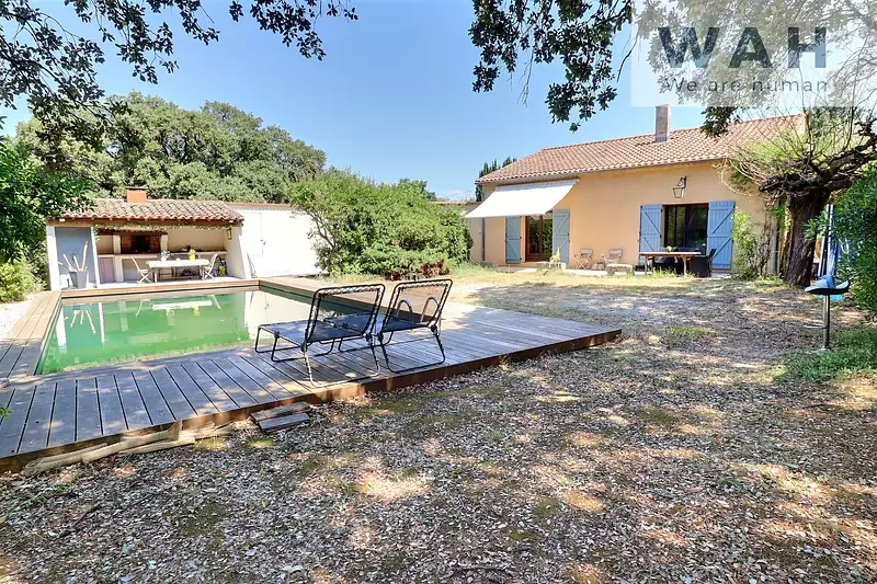 Située sur la commune de SOMMIERES (30250), célèbre pour sa cité médiévale et sa voie verte, entre Nîmes et MONTPELLIER, à 35 kms de la gare TGV, de l'aéroport et des plages, dans un environnement calme et arboré, je vous propose cette MAISON DE PLAIN PIED 4 PIECES de 100m2 habitables avec PISCINE et POOL HOUSE, sur un TERRAIN CLOS ET ARBORE de 2100m2, avec 2 GARAGES et dépendances.