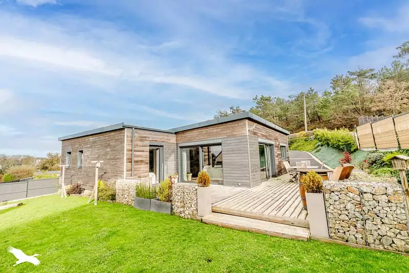 RARE SUR LE MARCHE ! Maison à ossature bois de 2021 à énergie passive. Située à 2 pas du bourg, elle vous offre en plain-pied : bel espace de vie de 42m² avec cuisine aménagée équipée donnant sur salon-salle à manger, 3 chambres dont une avec dressing, 2 salles d'eau dont une privative. Terrasse en bois et jardin clôt.