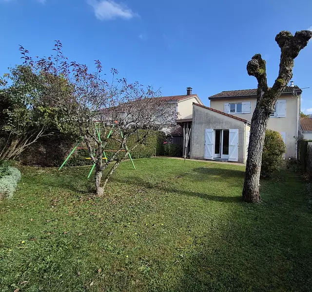A proximité des écoles, collèges et lycée, cette maison mitoyenne avec garage et un espace de stockage est édifiée sur un terrain de 309 m². Elle se compose d'une entrée, d'une petite buanderie et wc séparé, une cuisine équipée et un vaste salon séjour avec cheminée donnant sur une terrasse et le jardin. L'étage comprend un dégagement, une salle de bains avec wc (cabine de douche et baignoire) et 3 chambres dont deux sont équipées de placards muraux. Le logement d'environ 101 m² habitables est chauffé au moyen d'une chaudière individuelle au gaz de ville et la cheminée avec insert apporte un confort supplémentaire. En plus du garage, une place de stationnement est disponible devant la maison.
