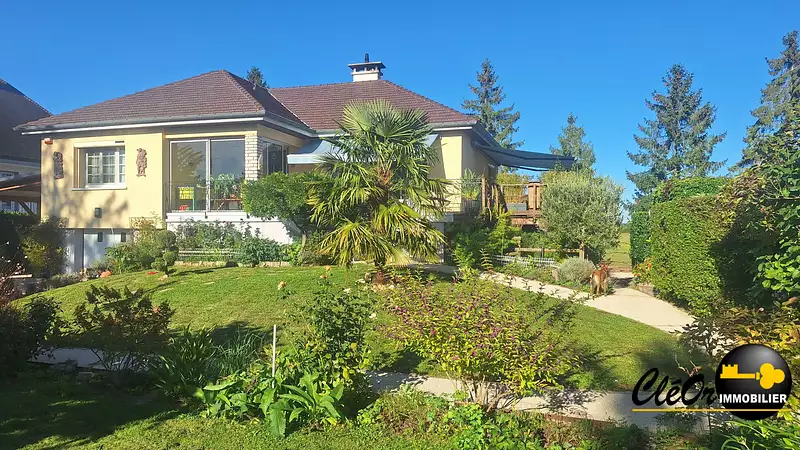 La véranda et le séjour sont baignés de lumière et offrent une vue imprenable sur le jardin et la terrasse. La cuisine, aménagée et équipée, est un véritable atout pour les amateurs de gastronomie. Un sous-sol et un double garage annexe complètent ce bien.