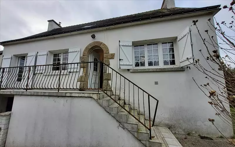 Carhaix, une maison d'habitation en parpaings sous toiture ardoises et construction 1975 comprenant :- Au rez-de-chaussée surélevé : Entrée, cuisine aménagée et équipée, salle à manger et salon avec poêle à bois, chambre, salle d'eau, wc.- A l'étage : Palier, 3 chambres (placards), cabinet de toilette (wc lavabo).Cave et garage au sous-sol.Terrain attenant 803 m²