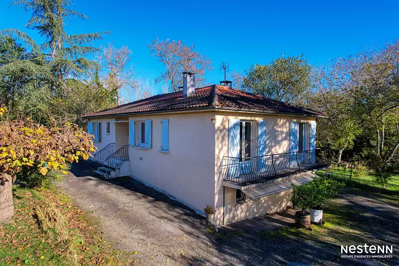 A la Vente Maison de quatre chambres sur parcelle de plus de 8 500 m² Cette maison des années 1970, d'une surface habitable de 102 m², repose sur un sous-sol de 95 m² et se situe dans un environnement verdoyant, aux portes de la ville. Quelques marches mènent à l'entrée principale qui s'ouvre sur un hall distribuant les différentes pièces de vie. La maison offre un séjour lumineux de 28 m² agrémenté d'un insert et prolongé par le balcon, ainsi qu'une cuisine indépendante de 10 m². Un couloir mène à quatre chambres confortables, dont les surfaces varient entre 9 et 11 m², une salle d'eau et des toilettes séparées. Depuis l'habitation, un escalier intérieur permet d'accéder au sous-sol, composé d'un vaste garage de 70 m² et d'un espace de 26 m² actuellement aménagé en buanderie. L'ensemble est implanté sur une belle parcelle boisée d'environ 8 500 m², offrant un cadre naturel à proximité immédiate de toutes les commodités de Condom. Une visite virtuelle est disponible sur notre site.