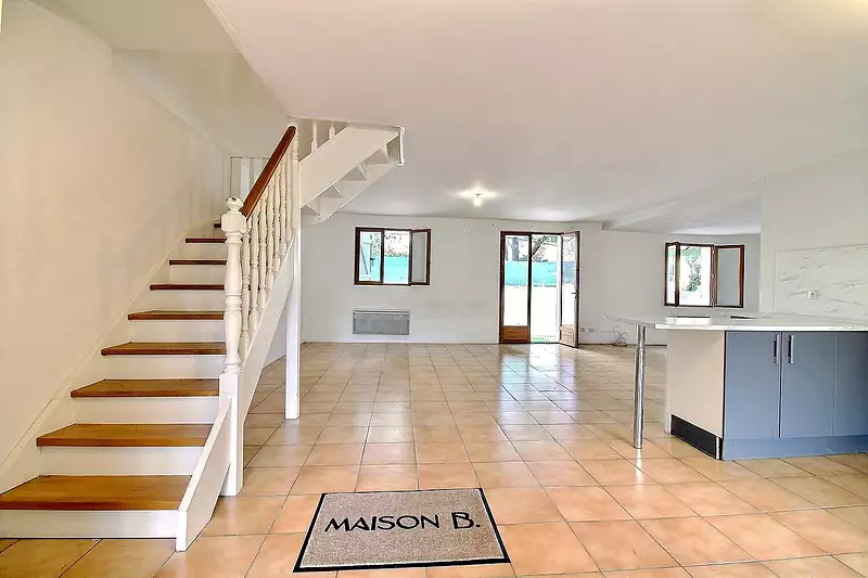 Construite en 1984, mitoyenne d'un côté et par le garage, de 102,28 m2, cette maison se compose au rez-de-chaussée d'un vaste séjour traversant de 57,27 m2 avec cuisine ouverte semi équipée et d'un WC séparé. A l'étage, un dégagement avec rangement dessert une chambre de 17,25 m2 avec placard et salle d'eau privative, une seconde chambre, une pièce supplémentaire à usage de chambre d'appoint/bureau et une salle de bains avec WC.Un grand garage comprenant une mezzanine pour stockage attenant à la maison et accessible par le séjour vient compléter ce bien. Possibilité de stationnement extérieur. Jardin clos avec espace terrasse, exposé EST.