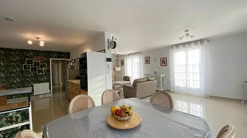 De plain-pied et offrant des prestations de qualité, cette maison dispose de 5 pièces, dont 3 chambres au rez-de-chaussée et propose une belle pièce de vie lumineuse de plus de 50 m2, exposée sud, avec une cuisine moderne ouverte, entièrement aménagée et équipée, qui s’ouvre sur une terrasse entourant le bien, parfaite pour savourer les journées ensoleillées. Une salle d'eau et un wc indépendant avec lave mains, complètent l'ensemble.