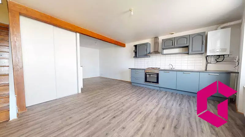 Séjour avec cuisine ouverte, buanderie, 3 chambres (dont une grande sous comble), salle de bain et 2 WC.