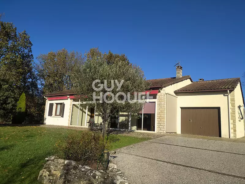 Construction traditionnelle de 1981 Véranda 22 m² avec volets électriques, entrée sur dégagement 10 m², séjour 32 m² avec cheminée, cuisine 18.80 m², cellier 5.6 m², 2 chambres 14.10 m² et 15.70 m², salle de bains avec douche 9 m², wc 2.37 m², chaufferie 5 m² garage 19 m² abri voiture jolie vue dégagée sur la nature (7.00 % honoraires TTC à la charge de l'acquéreur.)