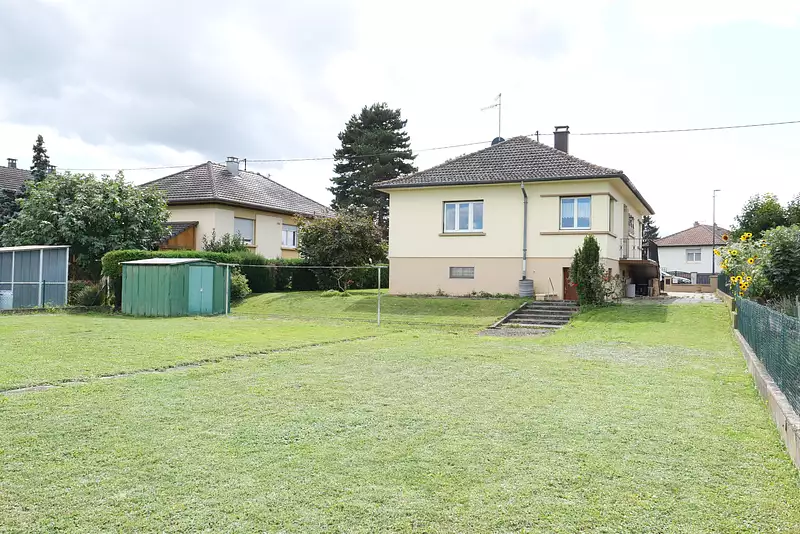 Denis Streicher 3G immo vous propose cette belle maison individuelle de plain pied située sur un grand terrain clos de 9 ares, très au calme à Ensisheim dans un quartier résidentiel. Cette maison de 103 m2 habitable est composée d'une cuisine séparée, d'un salon et séjour, de trois chambres à coucher, d'une salle de bain et d'un wc séparé. Avec un sous sol complet comprenant un grand garage avec atelier, une buanderie, une pièce et un cellier cave à vins. Chauffage au gaz, fenêtres et volets Pvc récents, adoucisseur d'eau et porte de garage motorisée font parties des éléments de confort de la maison. Prévoir rafraichissements salle de bain et cuisine mais très belle maison sur un grand terrain.
