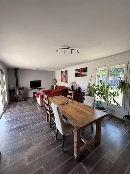 Édifiée sur un terrain de 957 m2, elle se compose d’un bel espace salon-séjour avec cuisine ouverte, d’environ 40 m2, très lumineux et convivial. Côté nuit, elle propose trois chambres, dont une grande chambre de plus de 16 m2, idéale pour une suite parentale ou un espace bureau confortable.