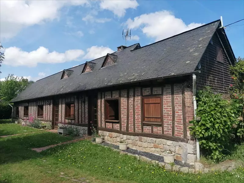 Maison Normande d'une surface habitable d'environ 104 m² élevée d'un rez-de-chaussée divisé en cuisine aménagée et équipée, séjour/salon avec cheminée, deux chambres, salle de bains, WC; d'un étage divisé en deux chambres mansardées; grenier; dépendance dans le style comprenant 2 garages/atelier d'environ 35 m²/pièce + partie grenier; Sur Jardin 920 m² ; Logement à consommation énergétique excessive. Les informations sur les risques auxquels ce bien est exposé sont disponibles sur le site Géorisques : www. georisques. gouv. fr
